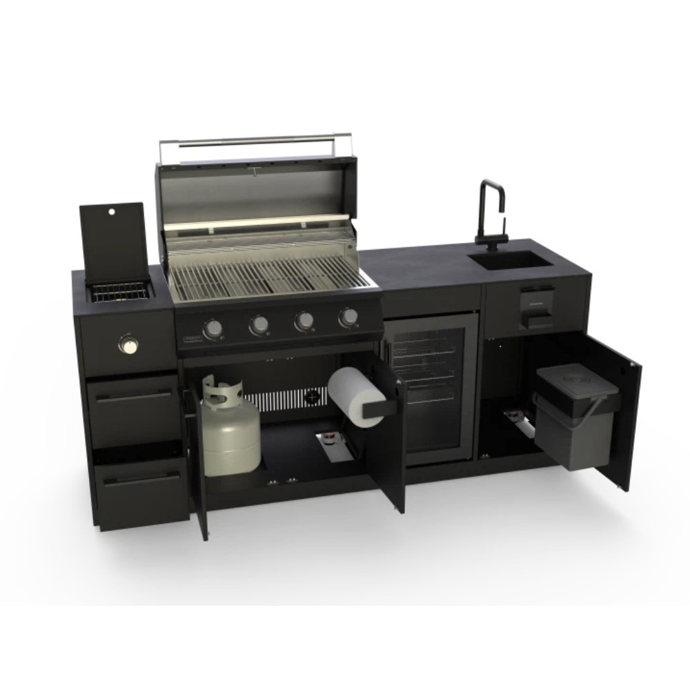מטבח חוץ Brabura Lite Series 400 BKC0032 מציע פתרון פרימיום מלא לבישול ואירוח בחוץ. המטבח כולל גריל עוצמתי מנירוסטה שחורה, כיור מובנה, מקרר 60 ליטר, כירת צד, מגירות וארונות לאחסון מרווח, ומערכת איסוף אשפה חכמה. המבנה עשוי פלדה מגולוונת בציפוי אבקה שחורה לעמידות בפני מזג אוויר, עם גלגלים נסתרים ורגליות מתכווננות לניידות מושלמת. פתרון יוקרתי ומקצועי לכל מי שמחפש לשדרג את חוויית האירוח והבישול במטבח חוץ מודולרי.