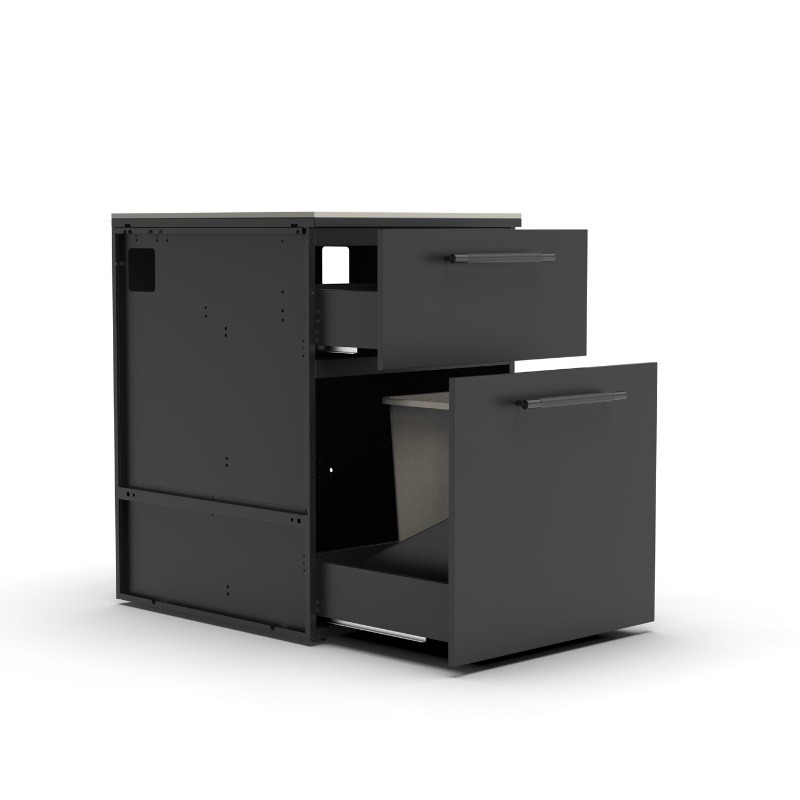 מודול מגירות האשפה CT 60 מבית Brabura מיועד לניהול פסולת נסתר במטבחי חוץ. המגירות כוללות מערכת דו-מגירתית עם סגירה שקטה (Soft-Close) ומשטח עליון מסוג Neolith המעניק עמידות גבוהה בפני מזג אוויר. המודול מספק פתרון פונקציונלי ודיסקרטי לשמירה על ניקיון והמשכיות עיצובית בפריסות מודולריות.