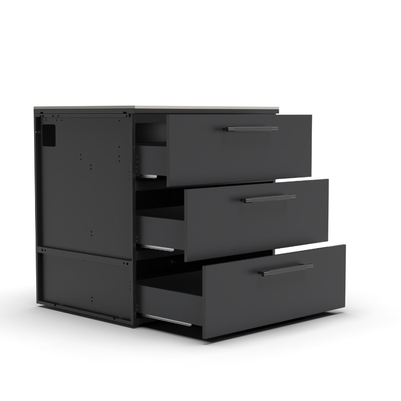 מודול CT 90 Drawers כולל שלוש מגירות רחבות עם מנגנון Soft-Close ומשטח עליון מסוג Neolith עמיד במיוחד. היחידה בנויה מפלדת אל-חלד בציפוי אבקה איכותי, המבטיח עמידות בתנאי חוץ לצד מראה יוקרתי. פתרון אידיאלי לאחסון חכם במטבחי Brabura – עם שילוב מושלם בין פרקטיות, אלגנטיות ועמידות לאורך שנים.