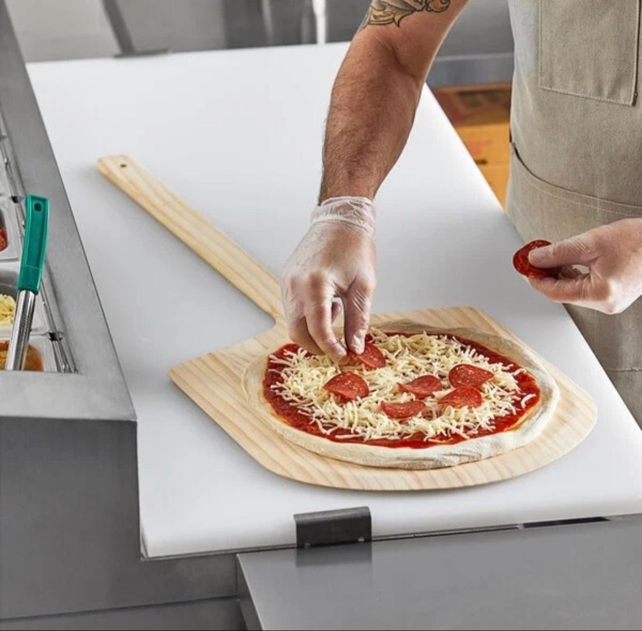 מרדה/כף עץ איכותית לפיצה, בעיצוב קלאסי ונוח לשימוש. מתאימה במיוחד להכנסה והוצאה של פיצות מהטאבון או התנור, ומבטיחה שליטה מלאה וחוויית שימוש מקצועית בכל אפייה.
