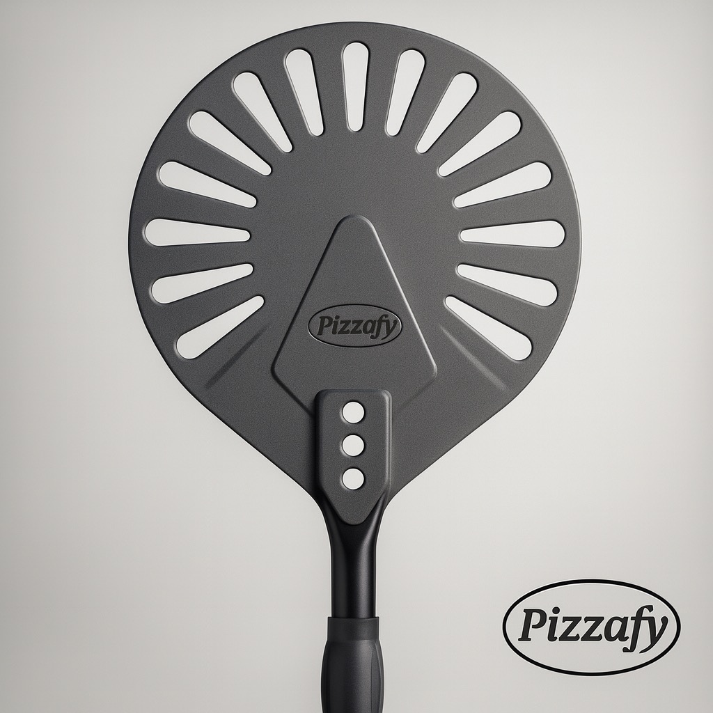 כף סיבוב מקצועית לפיצה בקוטר 23 ס"מ עם ידית שחורה באורך 71 ס"מ. הכף מחוררת לאוורור וניקוז קמח עודף, קלה לשימוש ומבטיחה עבודה נוחה ובטוחה בטאבון או בתנור.