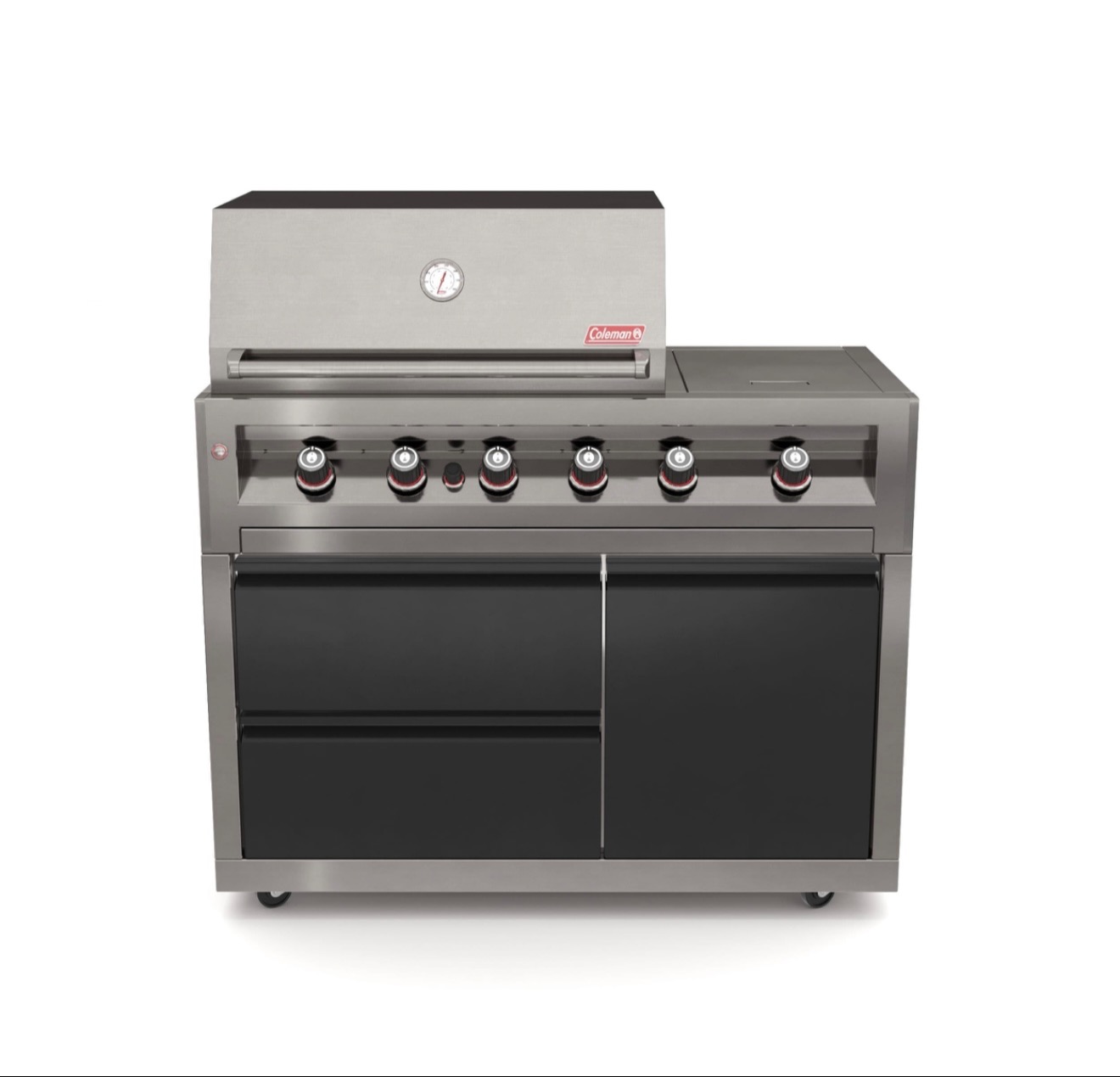 גריל הגז Coleman Premium עם 4 מבערים משלוב נירוסטה 304 מציע חוויית צלייה מדויקת, עוצמתית ונוחה. המבער האחורי בטכנולוגיית אינפרא-אדום יחד עם רוטיסרי חשמלי מאפשרים צלייה אחידה של עופות ונתחים גדולים, בעוד כירת הצד דואגת לרטבים ותוספות במקביל. החזיתות השחורות מעניקות מראה יוקרתי המשתלב נפלא במטבחי חוץ מודרניים.